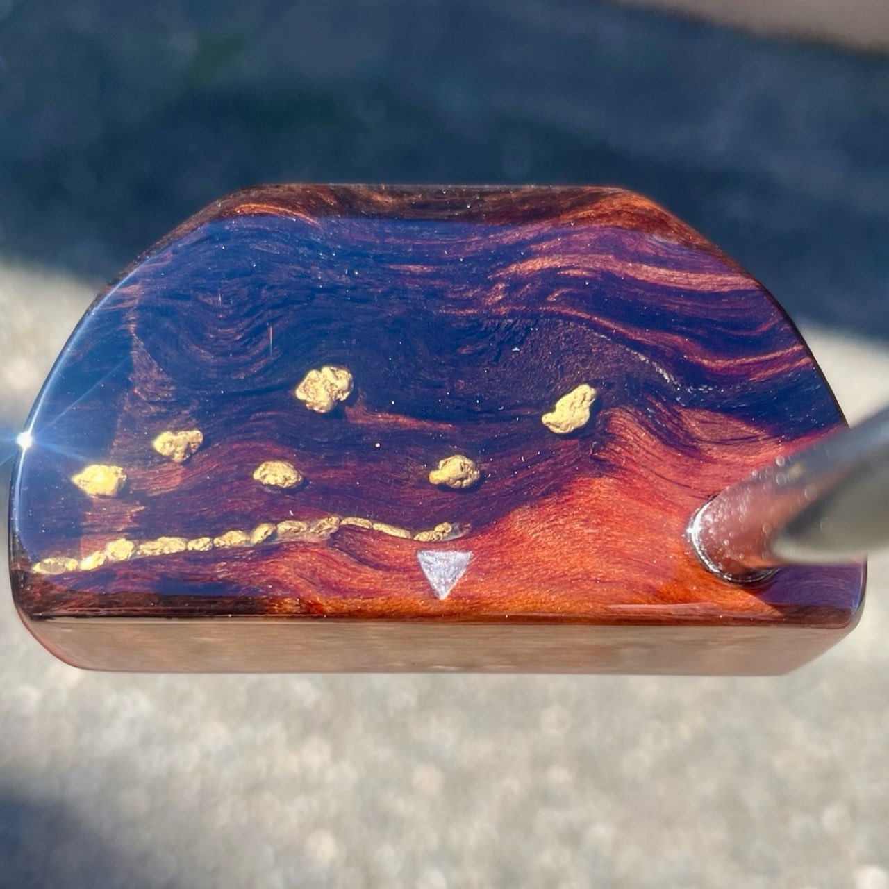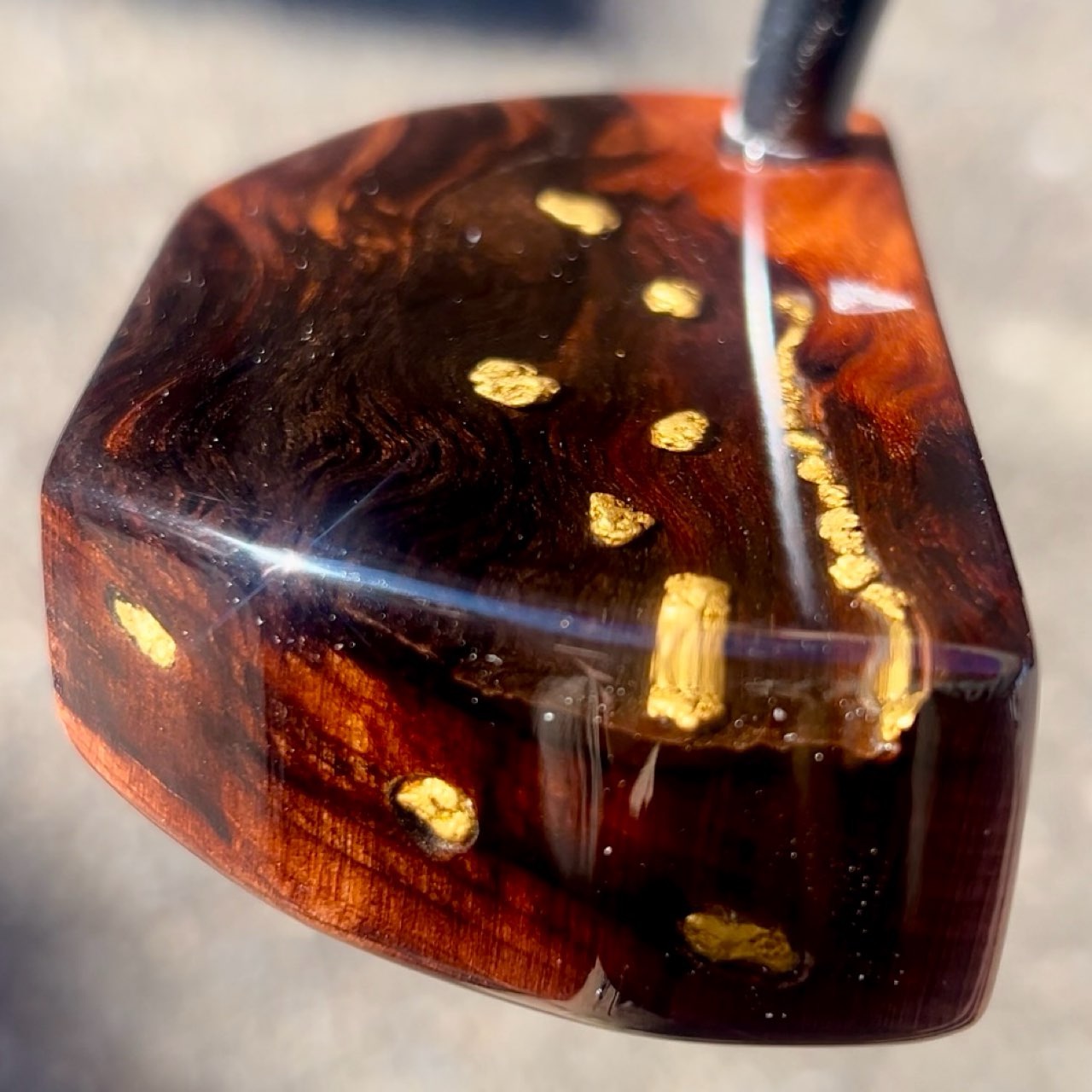 After careful thought and consideration, I decided to place the nuggets in both a vein and loosely along the top, as if they were resting in a creek. Then I carved pockets into the side of the putter and filled those with large, bright nuggets.
