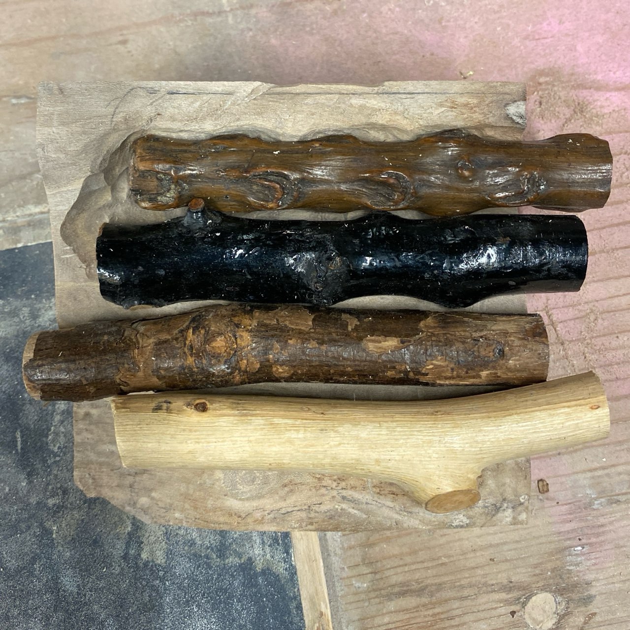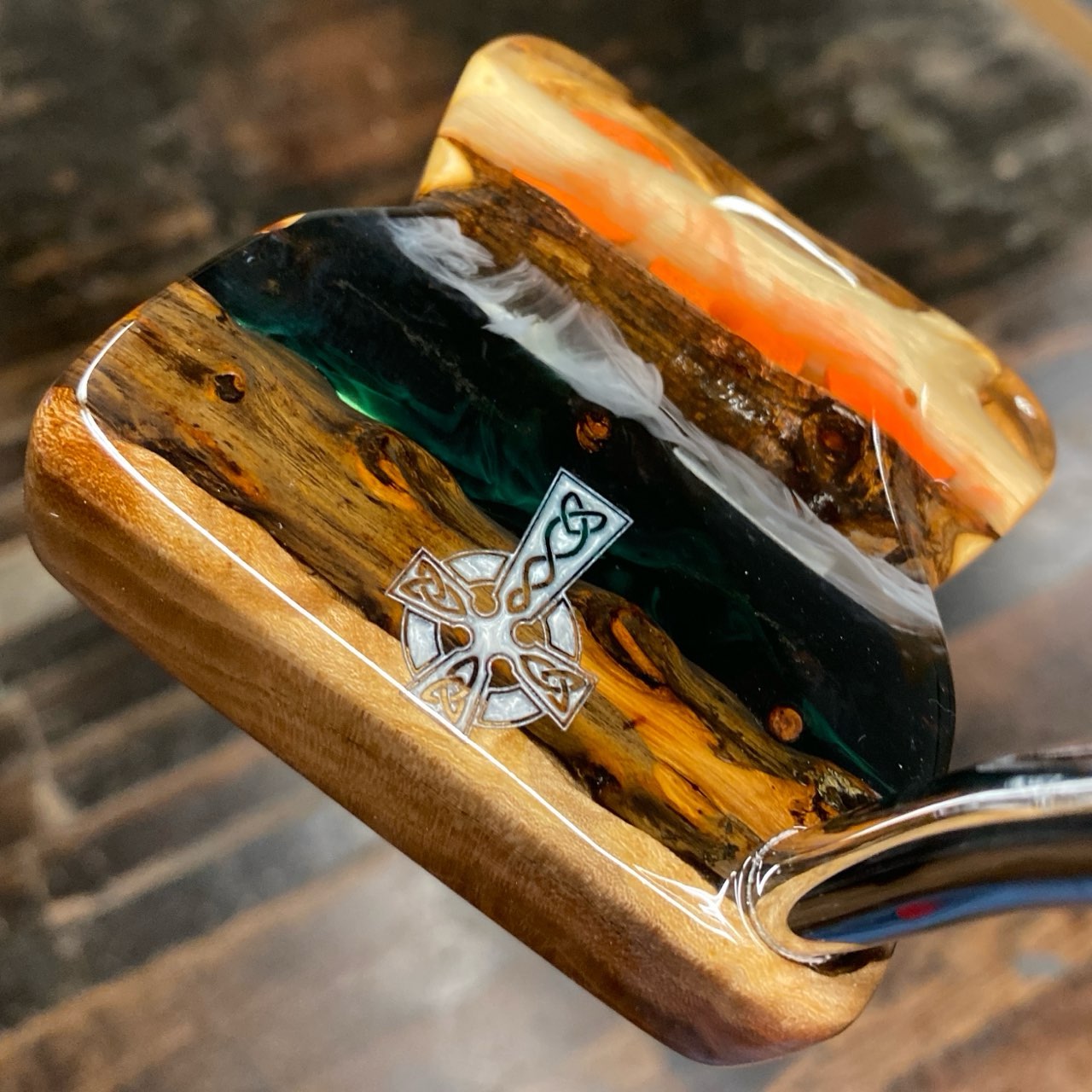 After cutting and placing the shillelaghs on top, we poured a clear acrylic with wisps of orange, green, and white between them.