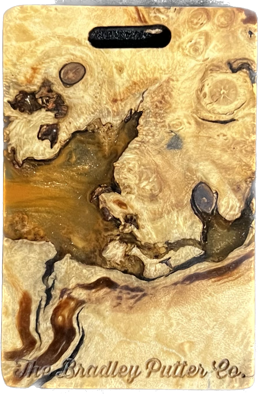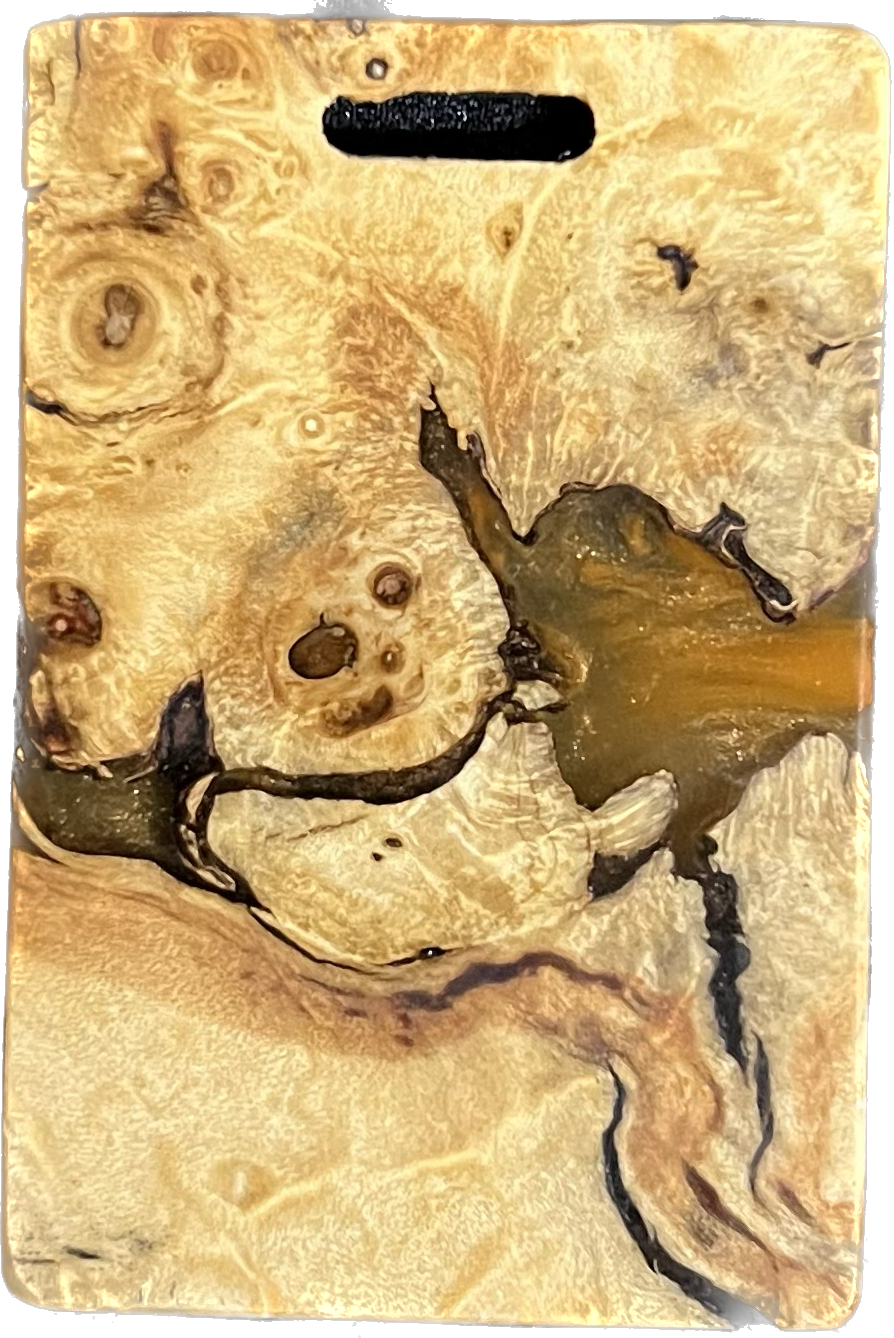 Add a splash of color to your golf bag with a Bradley bag tag. During the putter manufacturing process, there are often small pieces removed from the wood block during the shaping. These are then cut down to size, laser engraved to shape, and sanded by hand to remove the black scorch marks from the laser. They are then polished with a UV coating, and are now ready for your personalization. You are purchasing this exact piece, not one that will just look like it. Customize it further with your name, and even add a small single color image on the back.