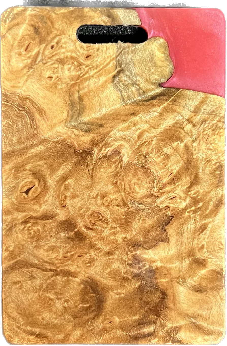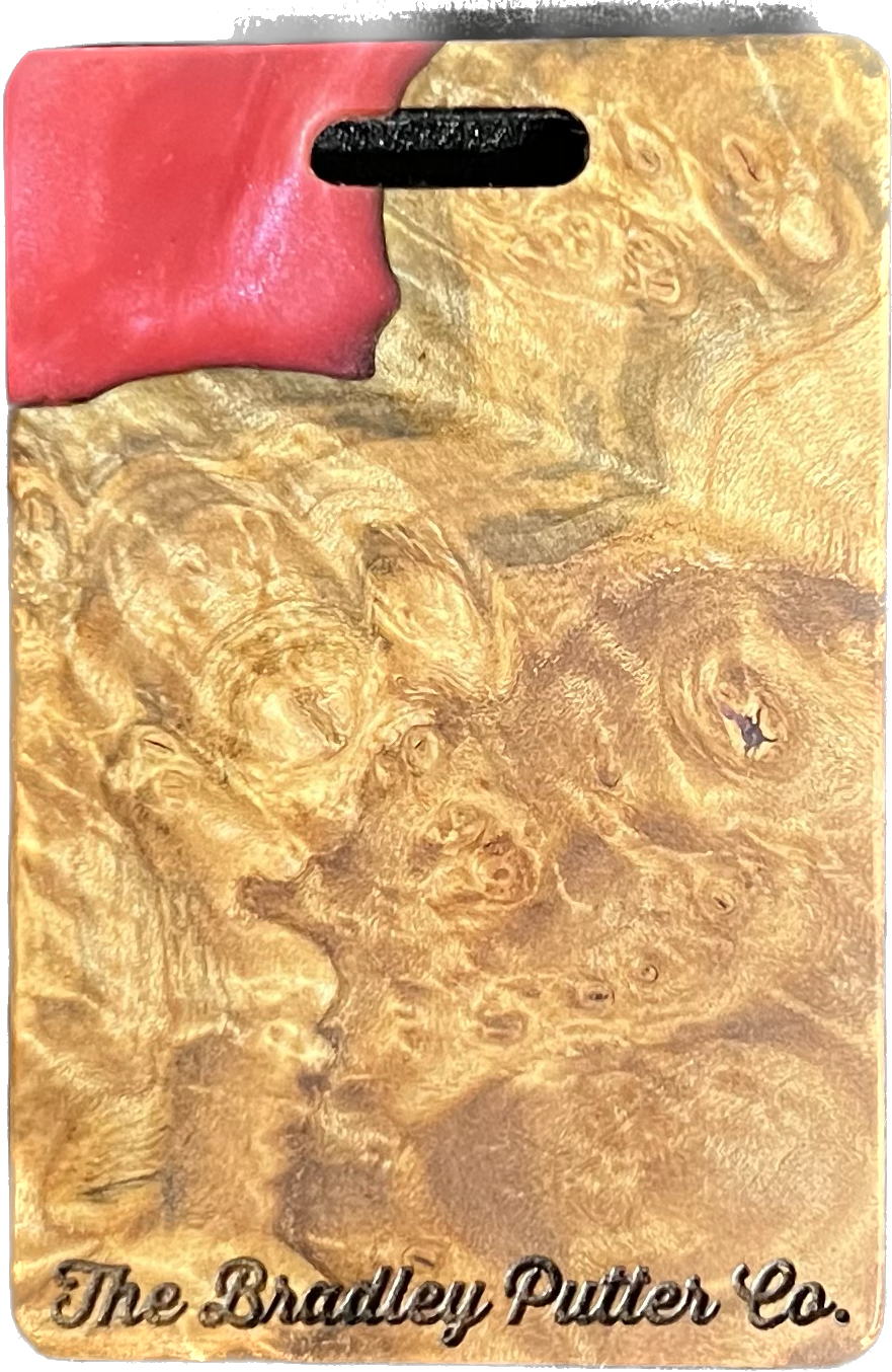 Add a splash of color to your golf bag with a Bradley bag tag. During the putter manufacturing process, there are often small pieces removed from the wood block during the shaping. These are then cut down to size, laser engraved to shape, and sanded by hand to remove the black scorch marks from the laser. They are then polished with a UV coating, and are now ready for your personalization. You are purchasing this exact piece, not one that will just look like it. Customize it further with your name, and even add a small single color image on the back.