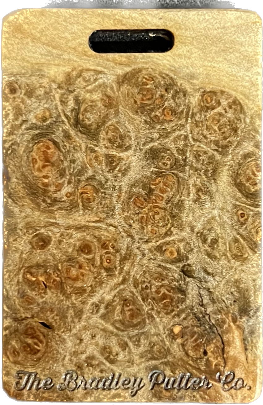 Add a splash of color to your golf bag with a Bradley bag tag. During the putter manufacturing process, there are often small pieces removed from the wood block during the shaping. These are then cut down to size, laser engraved to shape, and sanded by hand to remove the black scorch marks from the laser. They are then polished with a UV coating, and are now ready for your personalization. You are purchasing this exact piece, not one that will just look like it. Customize it further with your name, and even add a small single color image on the back.