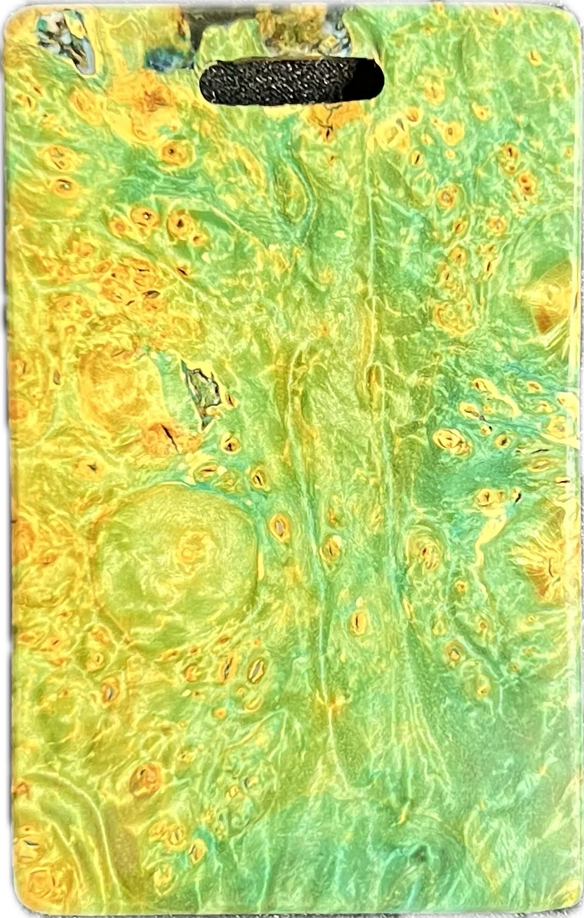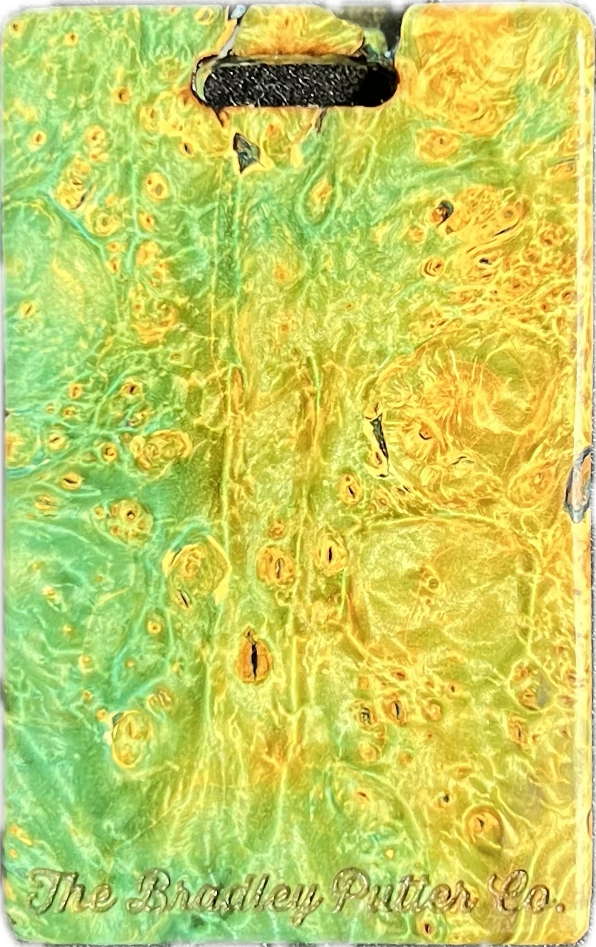 Add a splash of color to your golf bag with a Bradley bag tag. During the putter manufacturing process, there are often small pieces removed from the wood block during the shaping. These are then cut down to size, laser engraved to shape, and sanded by hand to remove the black scorch marks from the laser. They are then polished with a UV coating, and are now ready for your personalization. You are purchasing this exact piece, not one that will just look like it. Customize it further with your name, and even add a small single color image on the back.