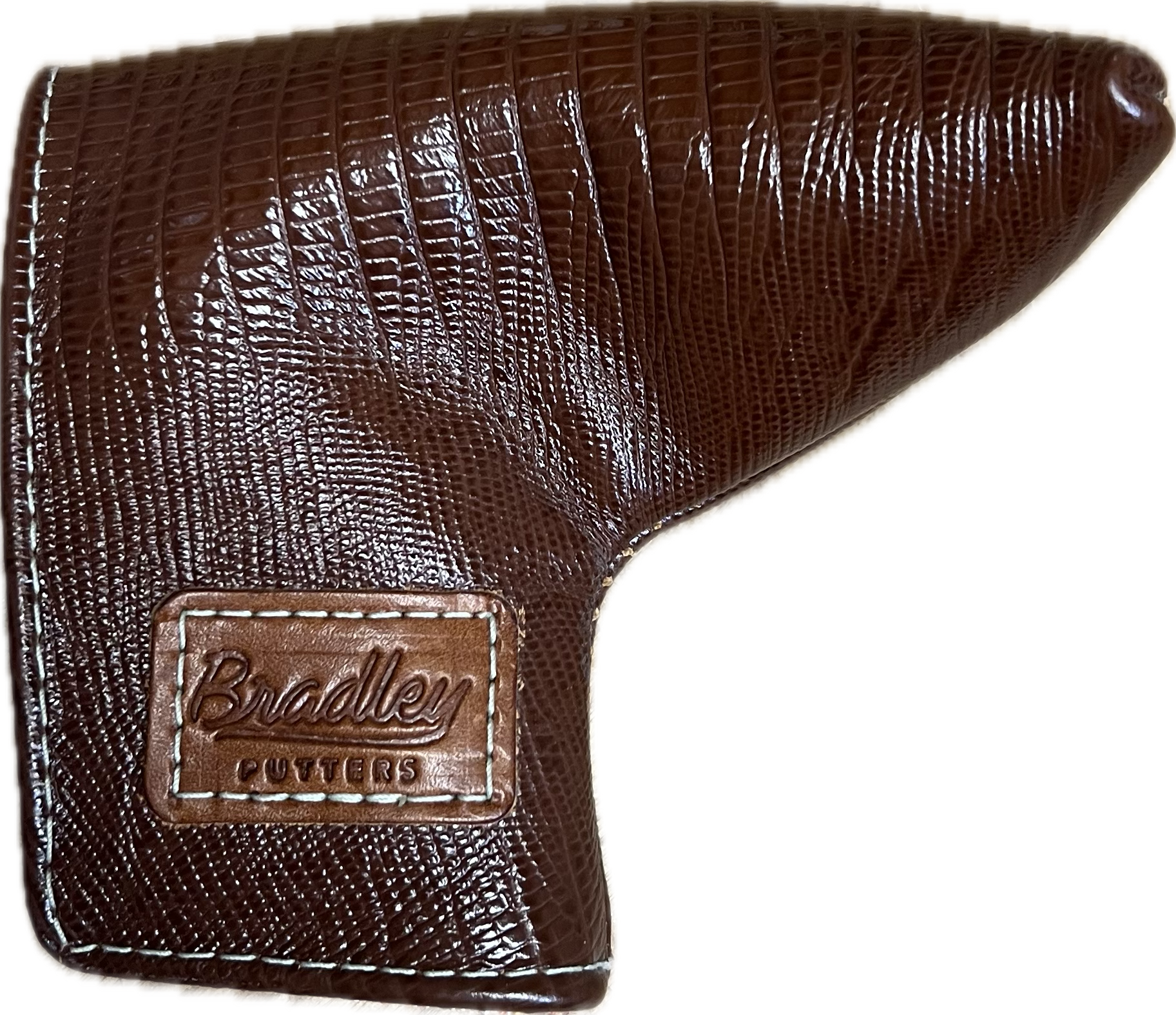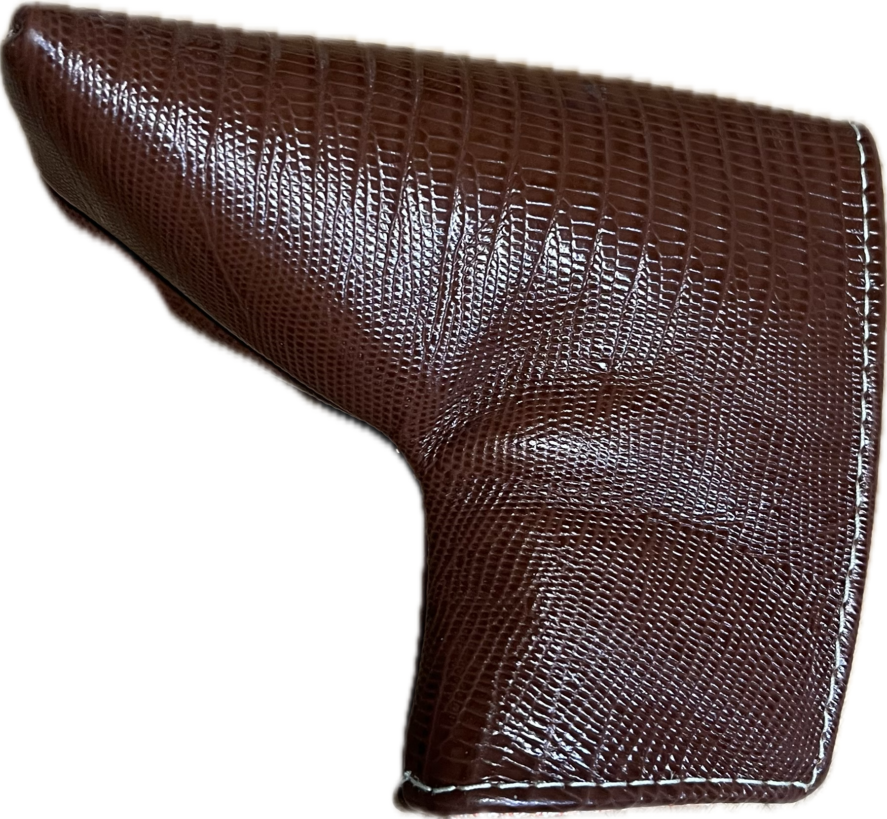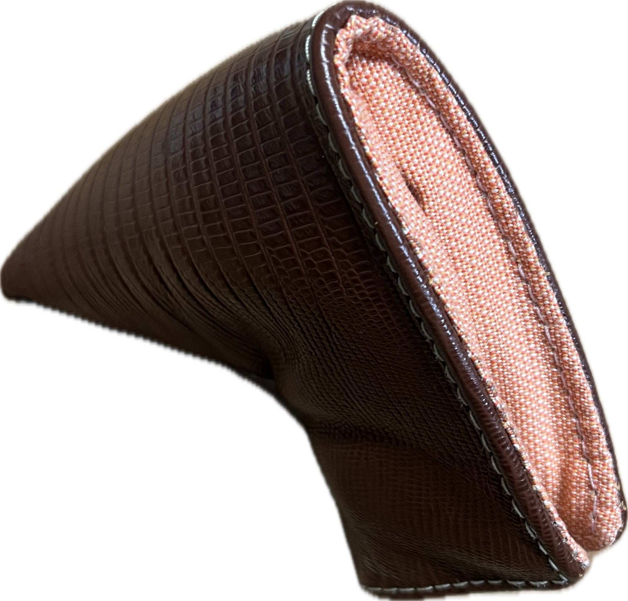 One of one exotic lizard blade headcover, with orange cream fabric interior. Strong magnetic clasps. Made in America.