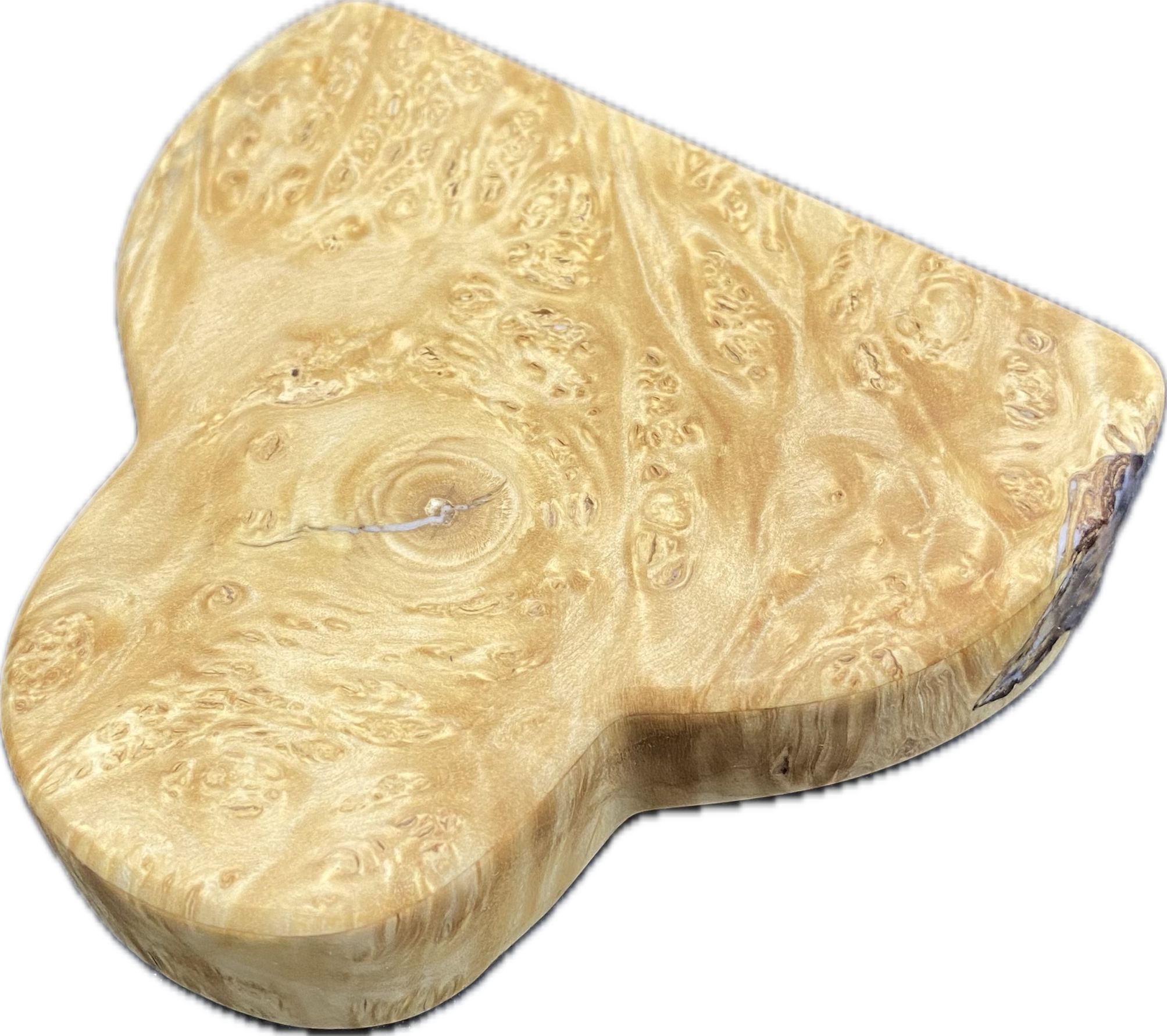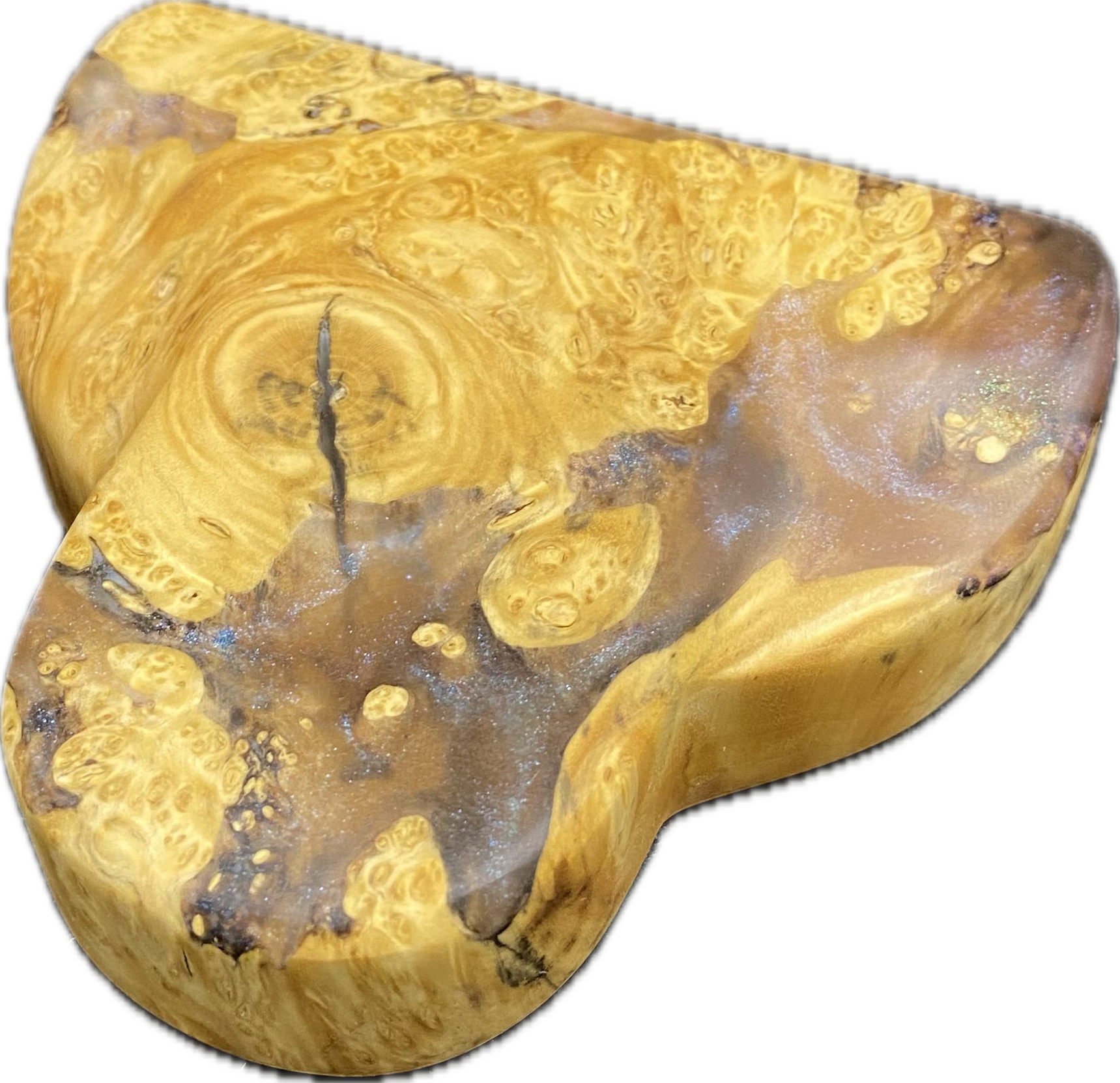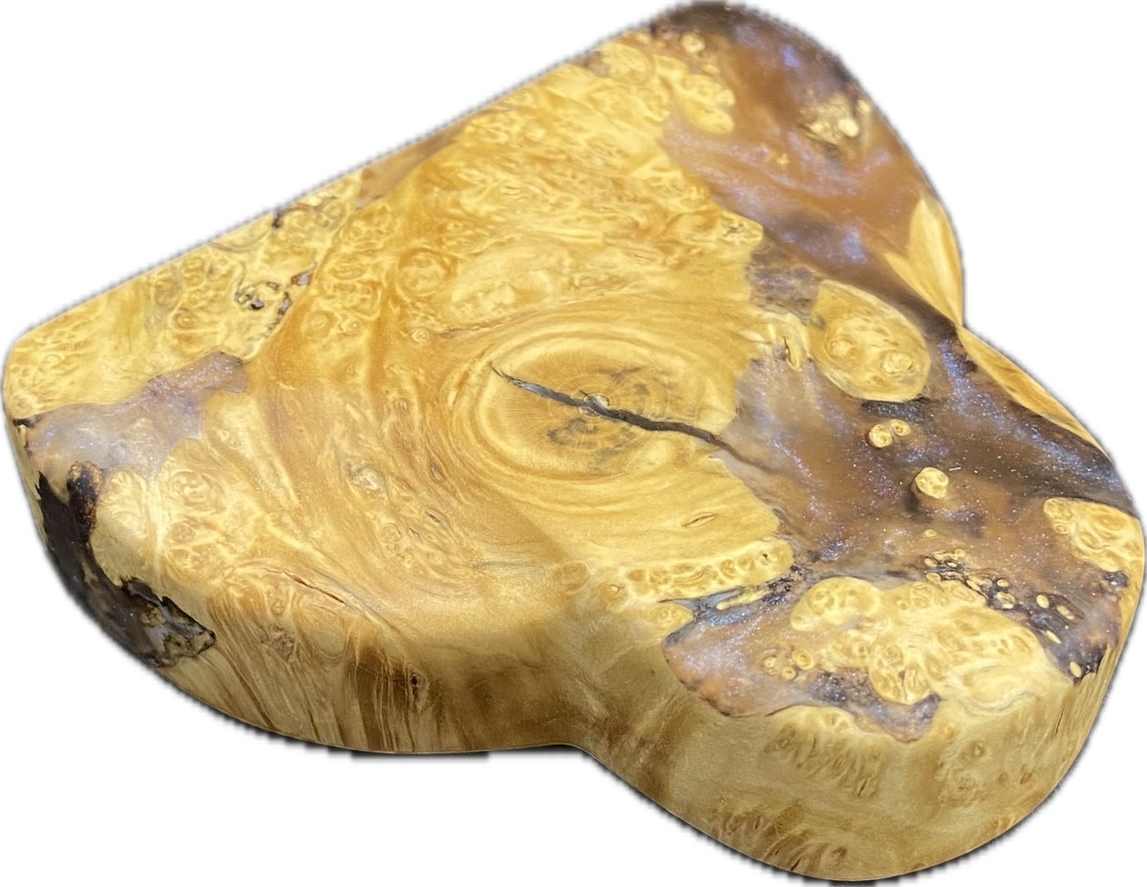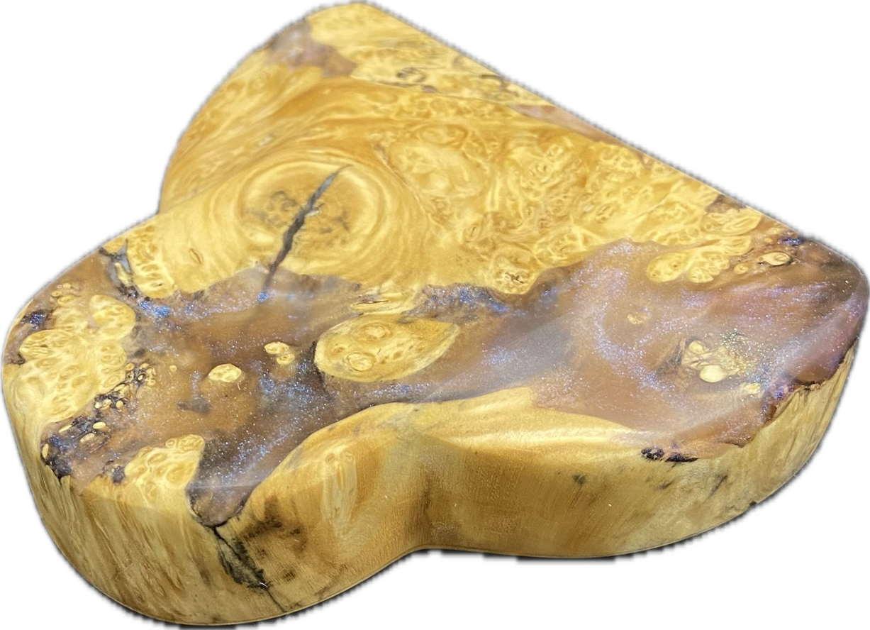 The maple burl wood pattern on this putter has every type of grain and character you could imagine. Then on the small amount of live edge, there’s a clear acrylic with the most subtle blue colorshifting powder.
